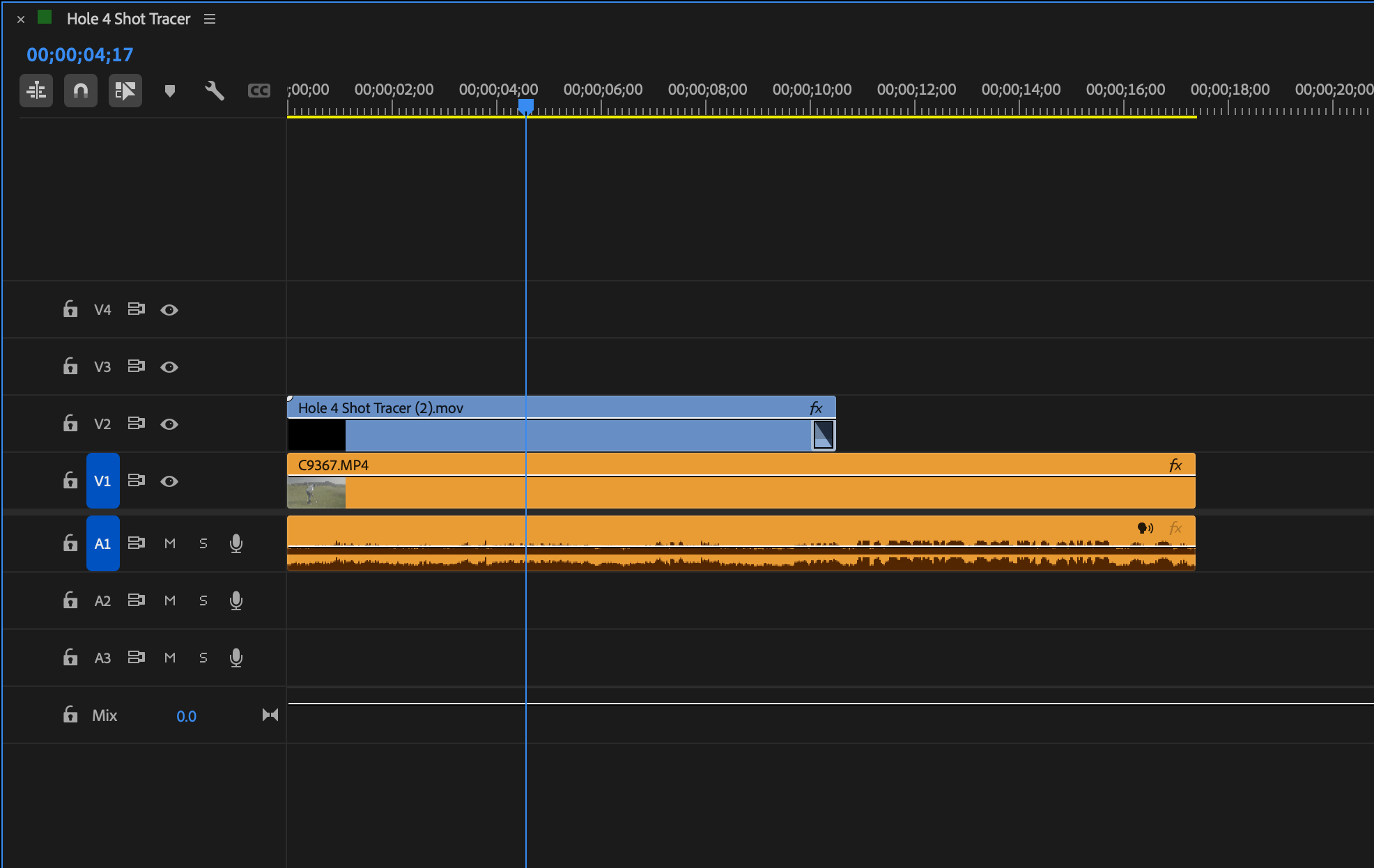 During the rough cut, you will also want to set up your shot tracers. We recommend nesting each shot that will require a shot tracer, typically drives and approach shots. Chipping usually does not need a shot tracer, but that is up to you. Nesting shots makes it easy to export all tracer clips and replace them later.